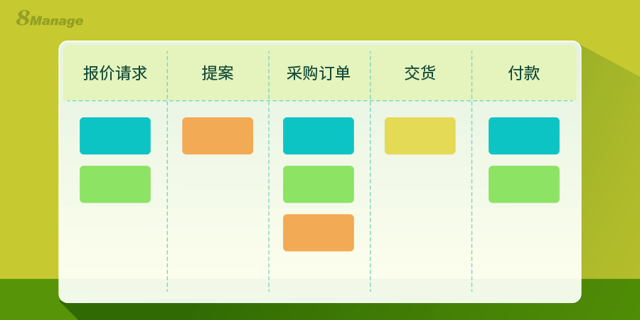 看板是采购团队的基础上合作,并保持采购秩序。8Manage SRM看板系统的目标始终是在采购中提供最佳的用户体验,并减少在流程上花费的时间,尽最大努力为你的团队提供敏捷采购的竞争优势。点击申请免费演示,我们将为你介绍8Manage SRM看板的更多内容。